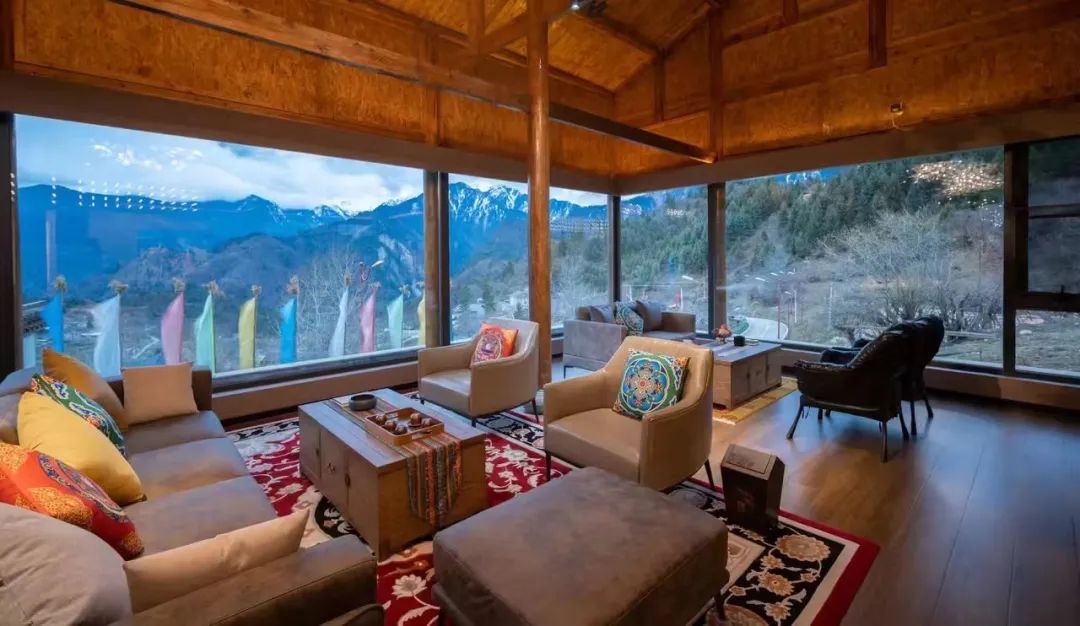 集接待大厅、藏文化体验区、文创产品展示厅等于一体的松风阁取名于宋代黄庭坚《松风阁》书法作品。 松风阁除以上展示区,还设置5个VIP餐饮包间,可同时供40位客人用餐,,每一个餐饮包间都面向雪山,宛如踏入浪漫的梦之境,在画卷中品尝人间烟火。 超大观景露台可以沉浸观赏静默的群山和盘旋的飞鸟,感受贫瘠又浪漫的意绪飘游,享受灵魂漂泊的超然。