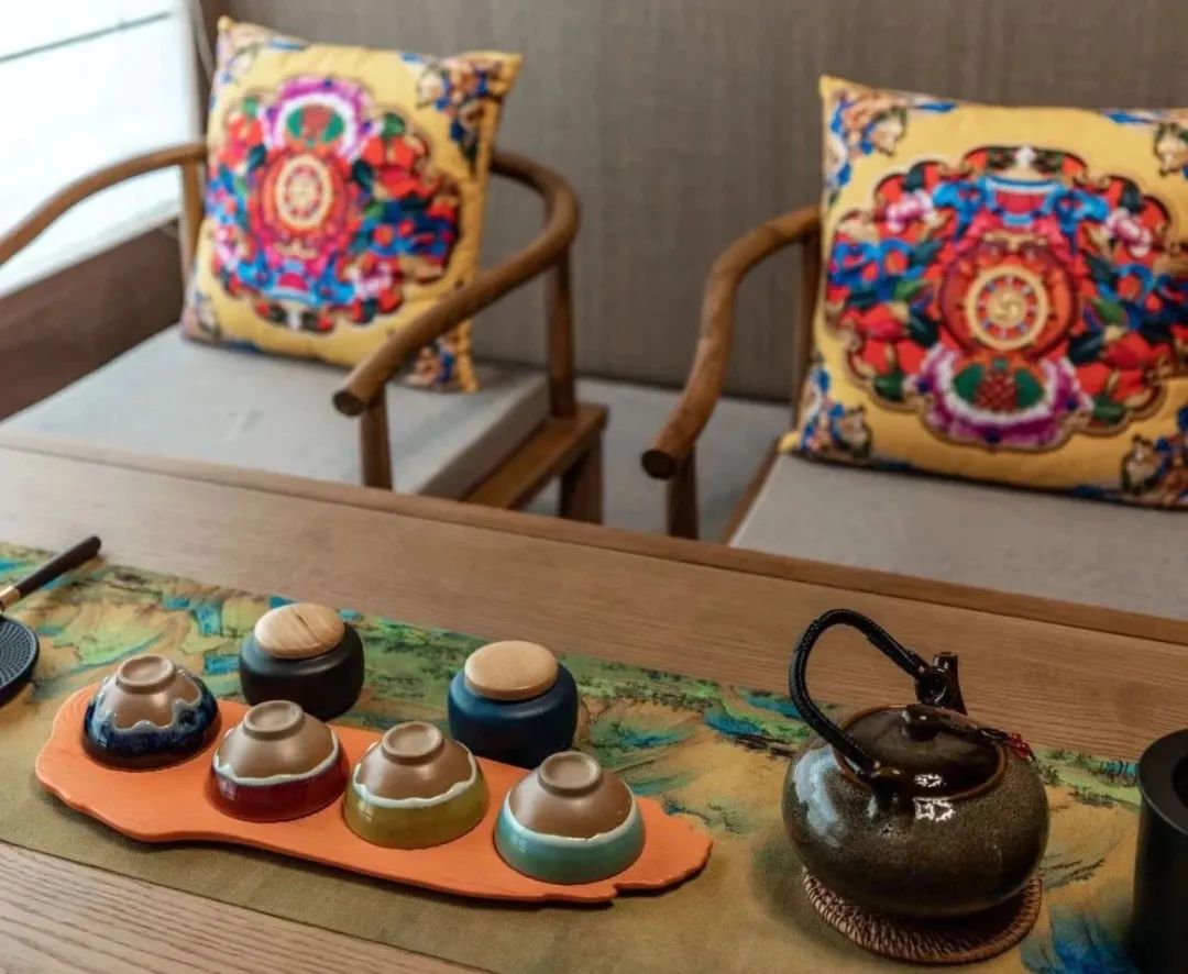 还植入了藏文化建筑的毛石墙体、木质屋面、静水平台、牦牛雕塑、哈达装饰的建筑文化元素,加上细部的藏式彩绘,构筑了一种全新的新藏式建筑风格。