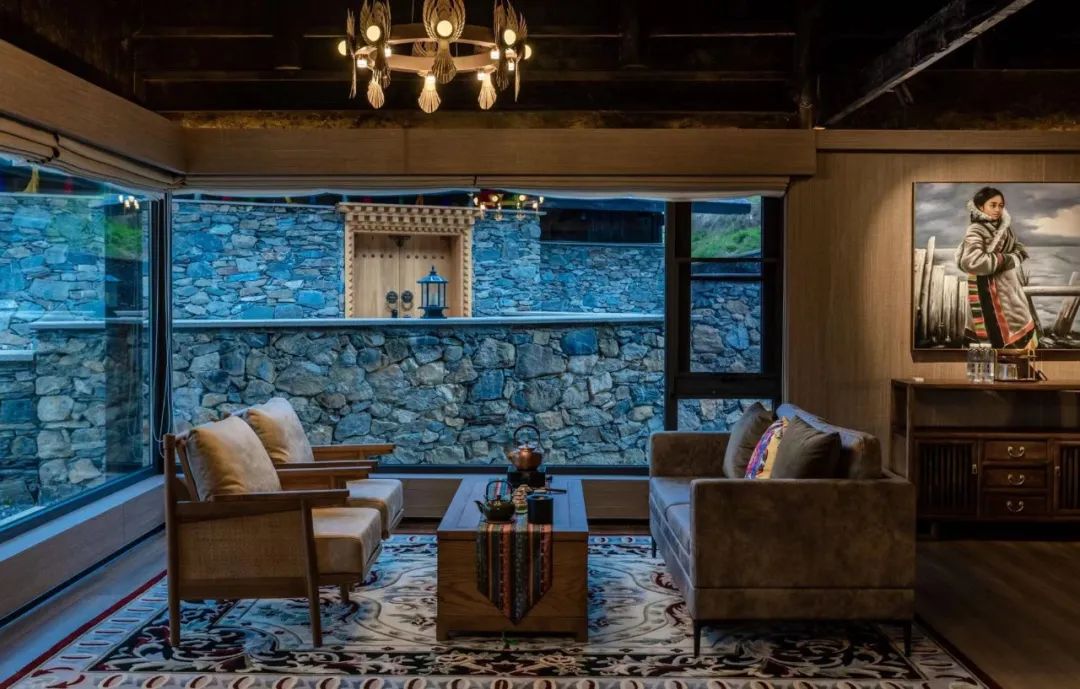 民宿从藏文化的三大体现“康巴藏族、嘉绒藏族、安多藏族”里的不同的建筑元素中,提取出具有共性的“原石、原木、原土、净水”建筑要素,打造出极具藏族特色的民宿建筑。