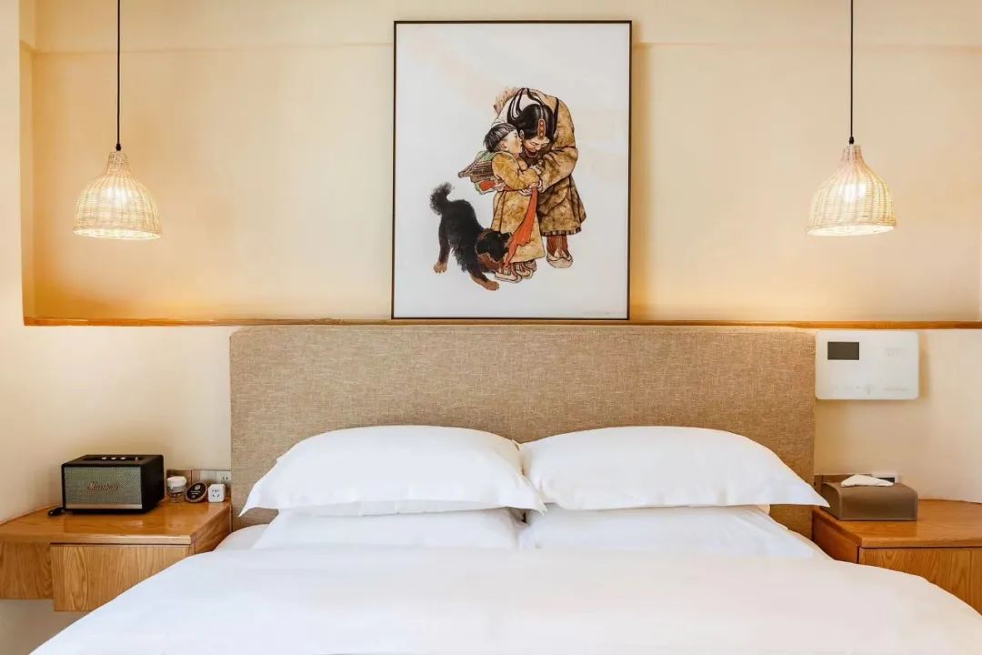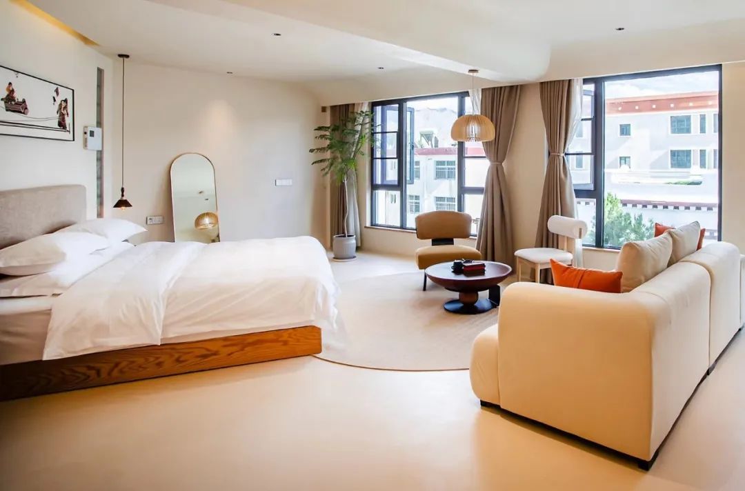 G318被美称为最美国道,我们沿着最美国道从东向西,历经武汉、成都、雅安,来到G318国道的临近终点站拉萨,在这里,我们将继续延续千里走单骑的品牌调性,为每一位从远方到来的朝圣者和旅客提供温馨的入住环境和亲切的服务体验。 千里走单骑·六悦民宿整体风格延续千里走单骑的品牌调性,首次将现代化简约风格与藏式文化装饰元素相结合,采用大量藏式花纹肌理,使旅客沉浸式体验藏族文化气氛,打造全新的入住观感体验。