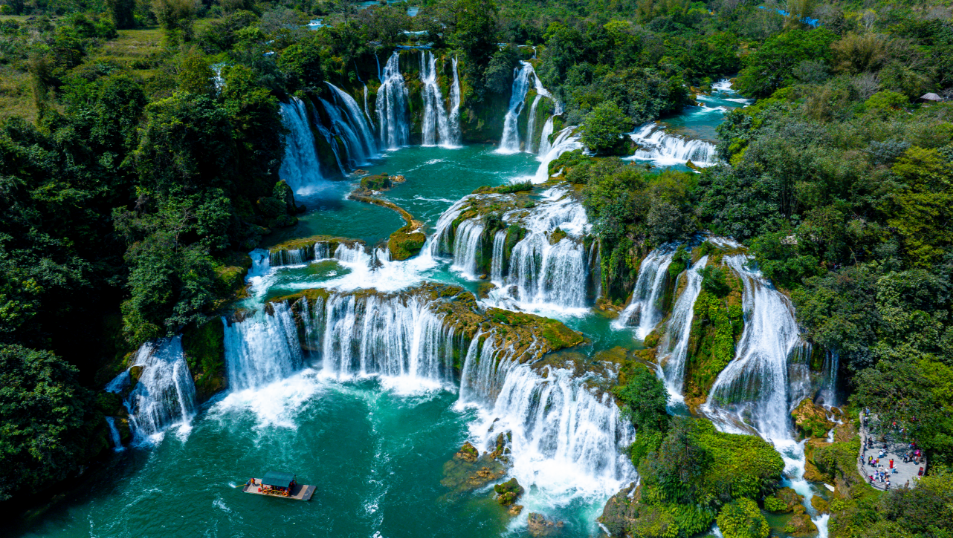 ▲ “中国第一处岩画类世界遗产”崇左左江花山岩画在中越边境广西崇左,黑水河蜿蜒在群山之间,滋养着这座中国蔗糖产量最大的甜蜜边城。“国家级旅游度假区”明仕田园内,明仕河悠悠流淌,这里也是电视剧《花千骨》中长留仙境的取景地。中越边境界河归春河在大新硕龙镇高崖三叠,造就了“亚洲第一大跨国瀑布”——德天跨国瀑布水雾冲天、声震四方的壮阔雄浑。  ▲ “亚洲第一大跨国瀑布”——崇左大新德天跨国瀑布“友谊关”是中国九大名关之中唯一还具有通关功能的关卡,也是我国西南地区通往东盟的重要经济通道。过去的镇南关,今天的友谊关,历经千年,勾连古今,面向东盟,见证了“南疆国门”的每一个重要历史时刻。