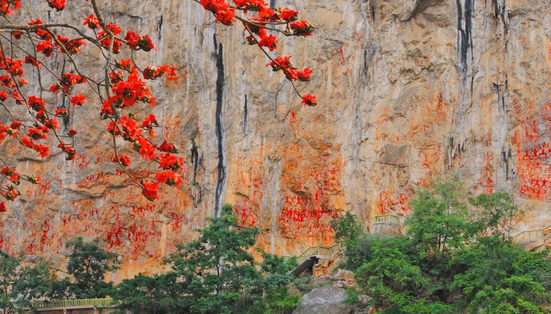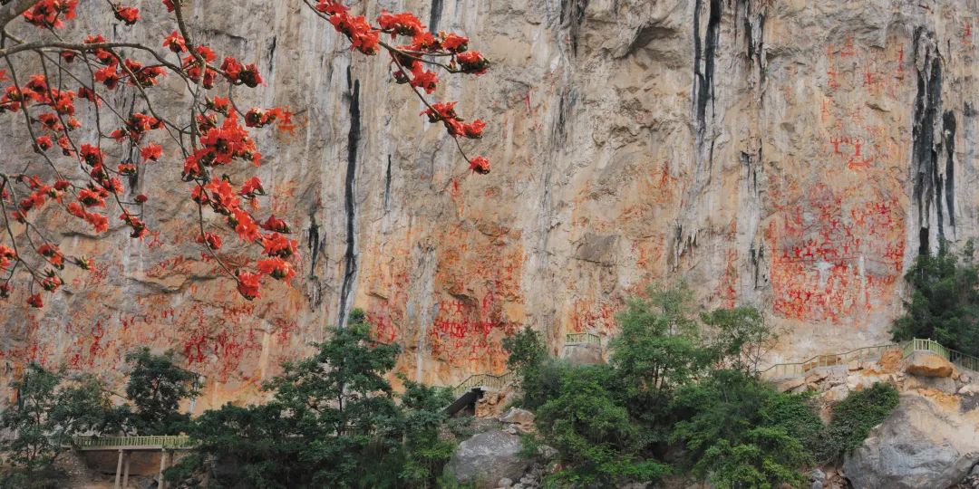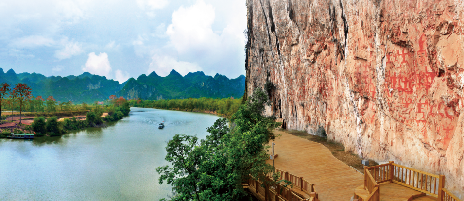 “中国第一处岩画类世界遗产”崇左左江花山岩画是永不褪色的骆越文化。早在先秦时期,古骆越人就在广西生息繁衍,创造了灿烂骆越文化。如今,左江及其支流明江边上的花山岩画仍在向世人诉说着那一段灿烂的历史。在那峭壁上,一幅幅红褐色的画面以人为主,配以兽、铜鼓、刀剑、羊角钮钟等,壮观而令人震撼。